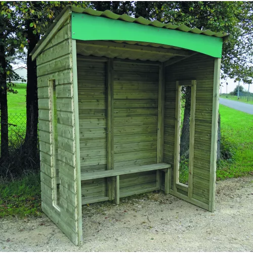 Matériau : En acier 50 x 50 mm Finition : Sablage et thermolaquage (voir RAL) Fond et Côté : En plexiglas transparent, épaisseur 8 mm Toiture : Bac acier galvanisé et laqué, couleur...