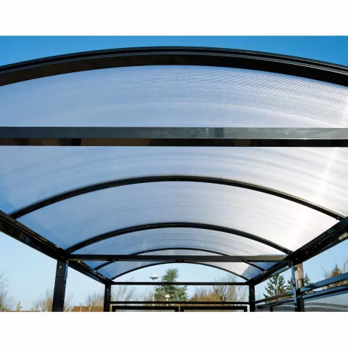 | Toiture | Traverses en tubes aluminium 40 x 60 mm et goutières en profilé aluminium 50 x 30 mm, peintes selon nos coloris, voûte en polycarbonate alvéolaire épaisseur 6 mm traité anti-UV |
