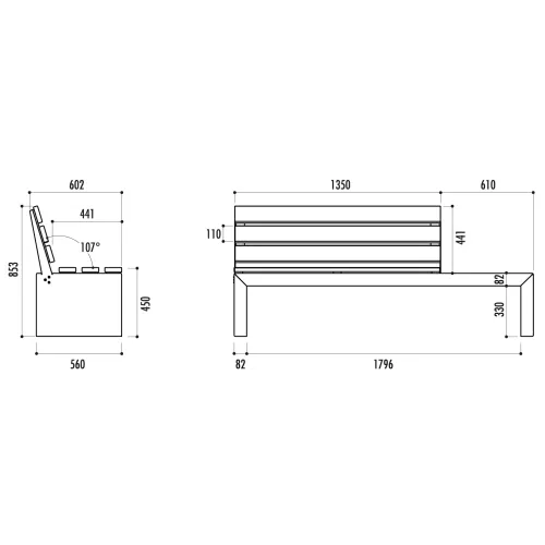 Longueur1800 mmStructureTube acier ø 76 mmAssiseTôle acier perforée de 2 mm, cerclée d’un tube acier ø 38 mmFinitionPeint sur zinc selon nos colorisFixationScellement direct