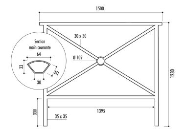 Deux longueurs800 ou 1500 mmDeux cadresSimple croix ou rosaceTrois mains courantesSans crosse, simple crosse ou double crosseHauteur hors sol1000 mmPoteauxTubes acier 35 x 35 mmFinitionAcier peint...