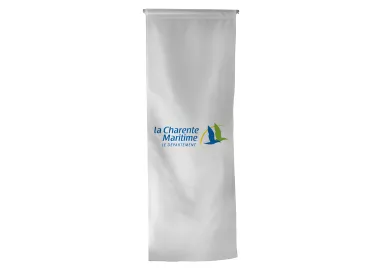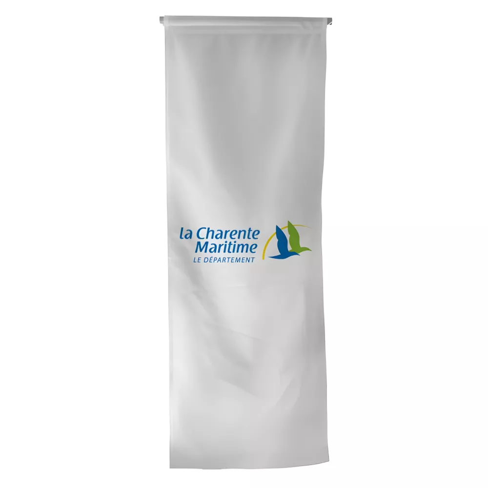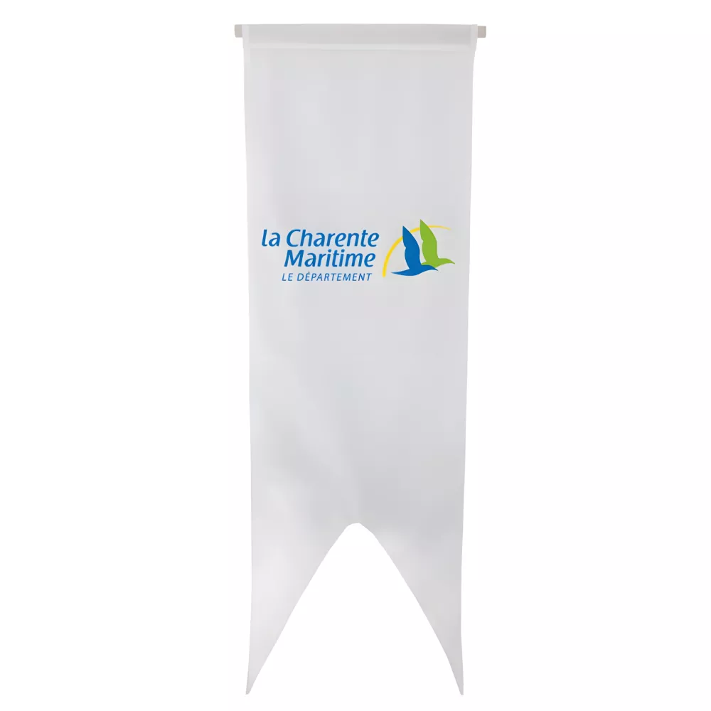 Cette oriflamme du Conseil Départemental de Charente-Maritime est réalisée en maille polyester 115 g/m² 3 fils bloqués. Disponible avec finition droite ou queue de pie, elle comprend un fourreau supérieur, des ourlets latéraux et une traverse en bois avec cordelette. Personnalisable avec blason, texte ou logo, elle convient pour un usage intérieur et extérieur.