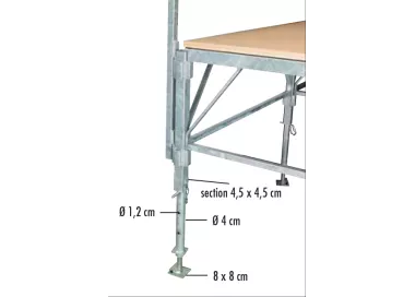 - Entretoises : en tubes carré et rectangulaire pour le support de plancher, équipés d'ergots qui viennent s'imbriquer dans les anneaux des pieds réglables ; une fois le maillage métallique effectué, les planchers peuvent être posés (des tasseaux vissés sous le panneau permettent de bloquer le plancher)