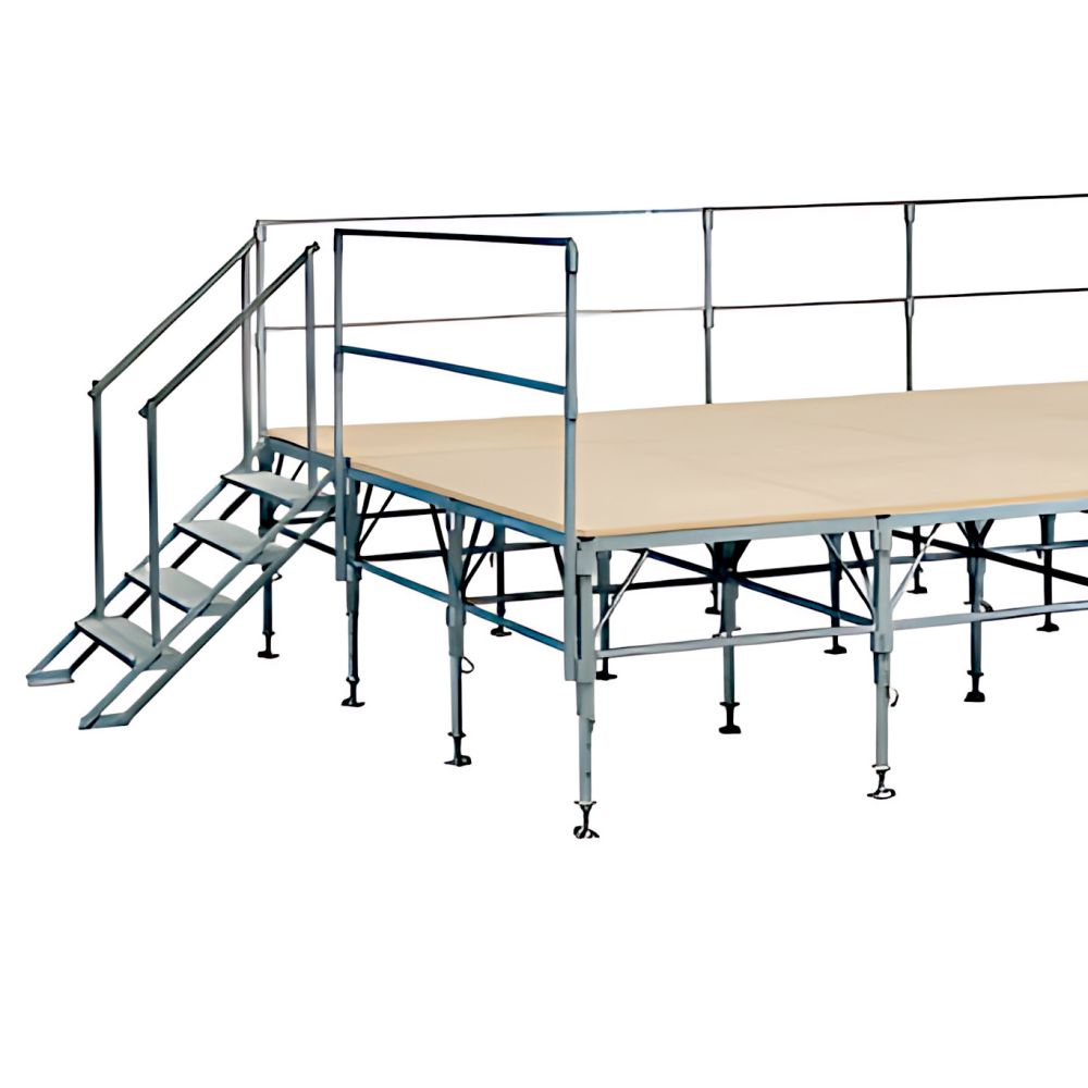 - Garde-corps : de sécurité galvanisé à chaud, situé sur les 3 côtés de la scène (sauf devant la scène), escalier d'accès larg. 101 cm (intérieur) avec garde-corps de sécurité compris