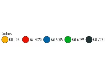 Structure : en fer plat 25 x 4 mm Finition : peinture au four coloris RAL 6005 (vert mousse) ou, en option, autres coloris standards RAL 1023 (jaune trafic), 3004 (rouge pourpre), 5010 (bleu...